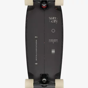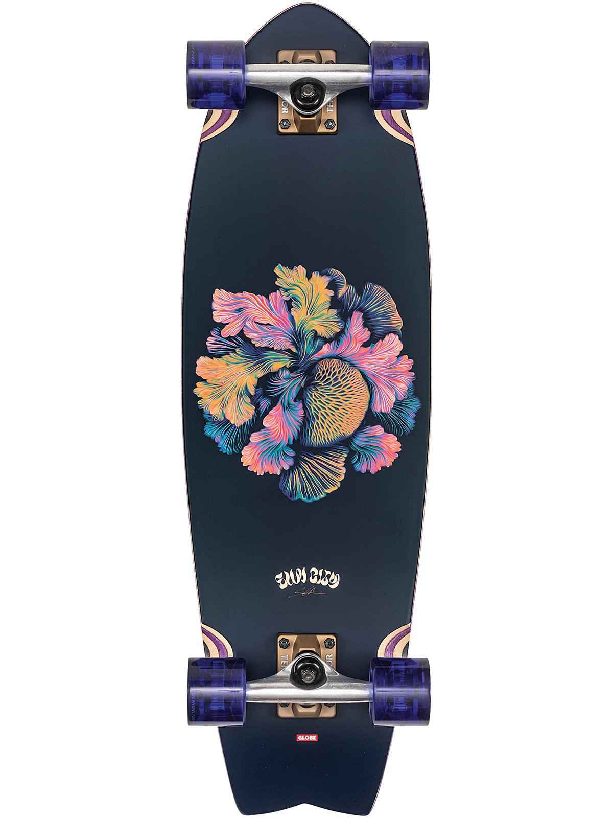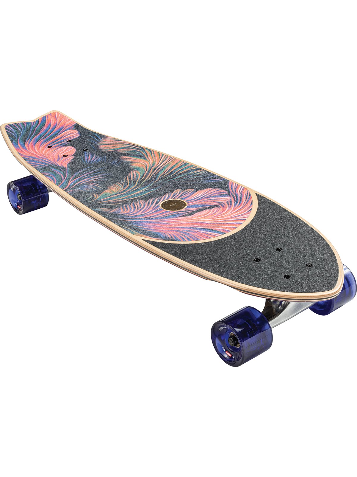 Le Sun City in Coral Unity est un cruiser à queue d’hirondelle de taille moyenne, inspiré du surf, avec une illustration de pont et de ruban adhésif de l’artiste vedette Sam Chirnside.